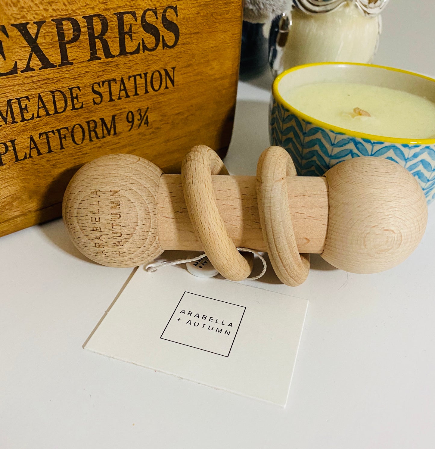 The Arabella + Autumn Hubble Rattle is made from beechwood with rattle rings which make the sweetest woody sound as they're shaken around.
